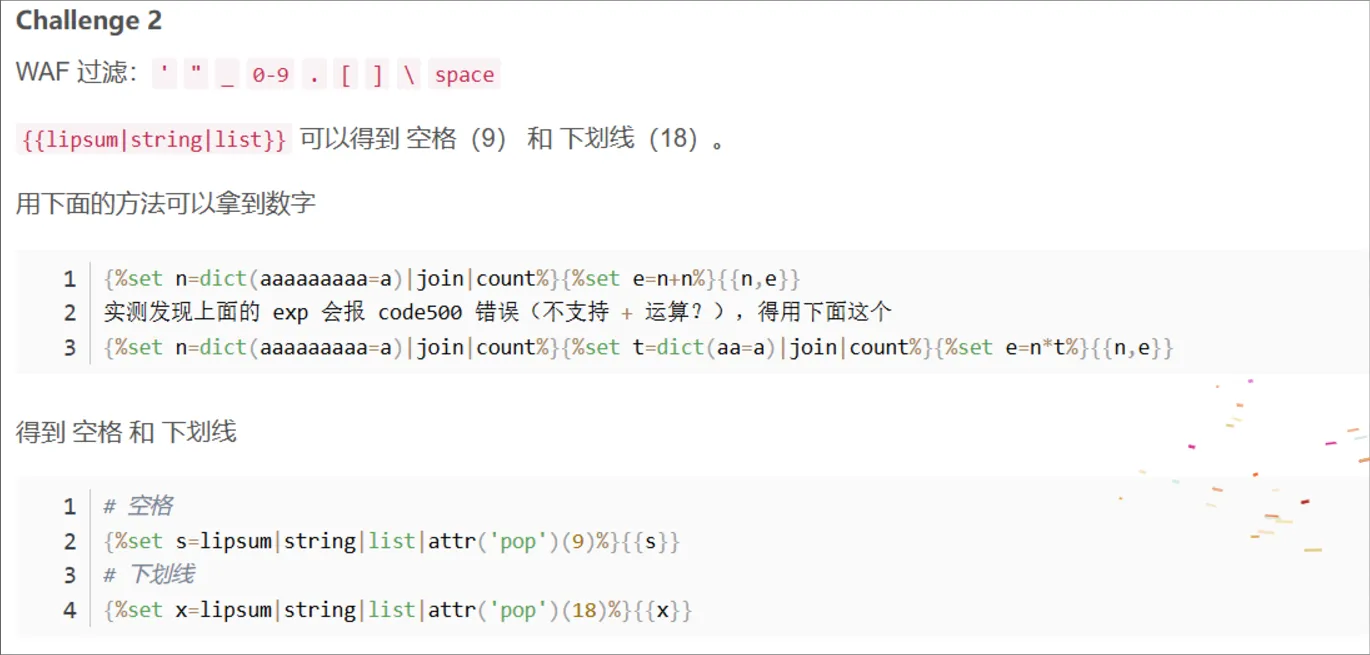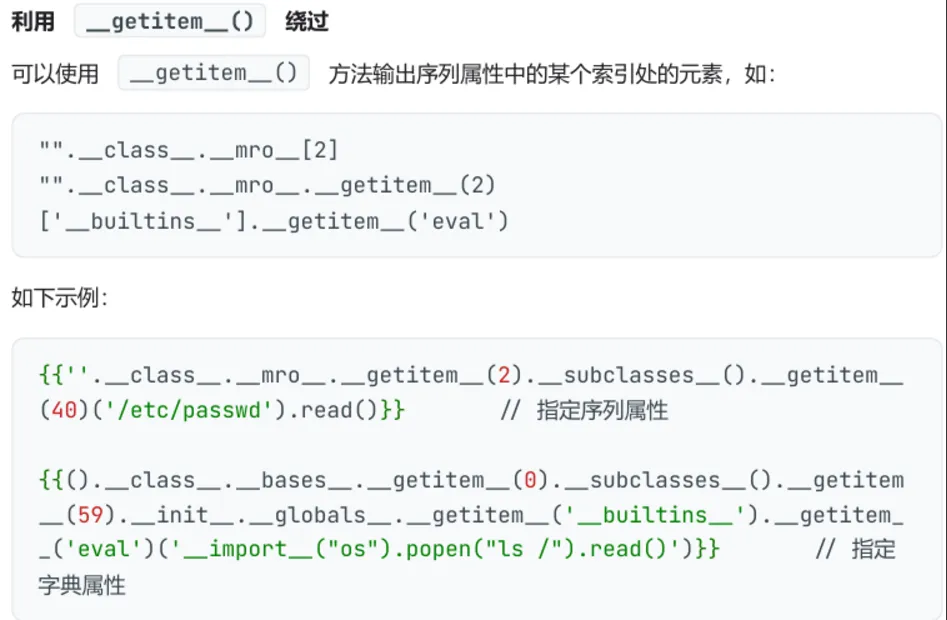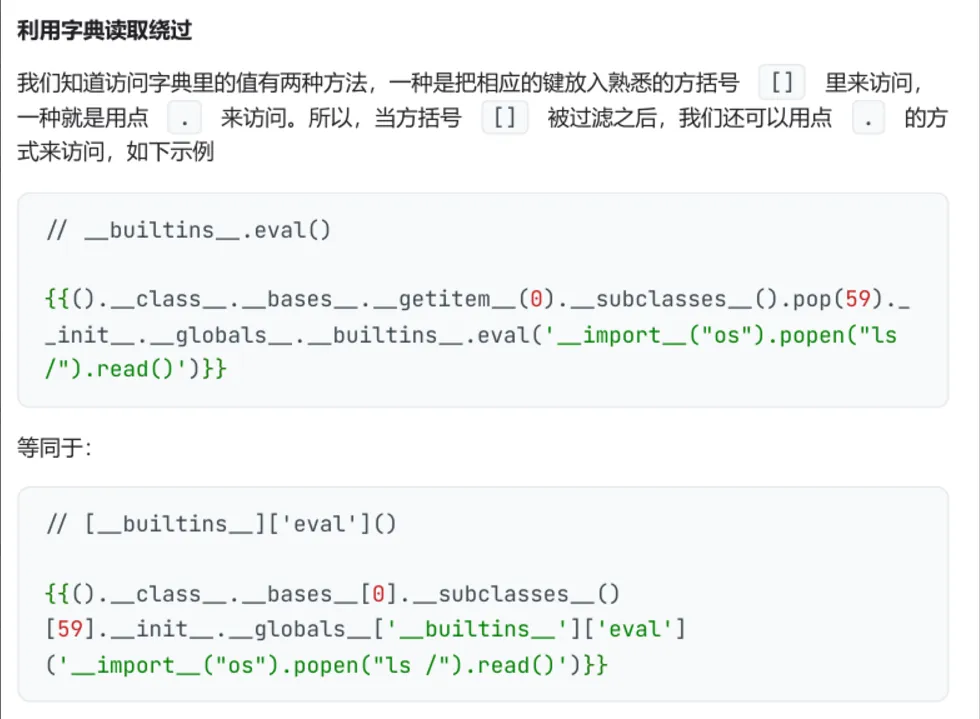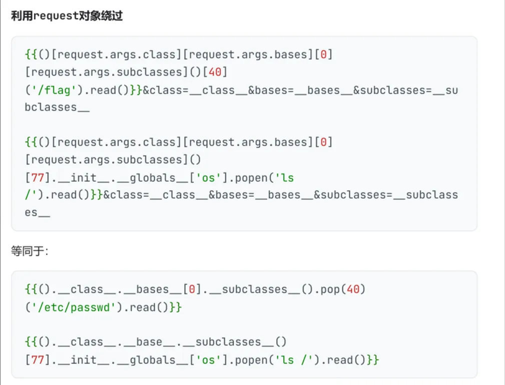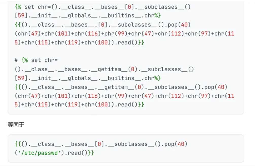 {%set gc=()|attr(cl)|attr(ba)|attr(su)()|attr(ge)(num)|attr(in)|attr(gl)|attr(get)(bu)|attr(get)(ch)%} # gc为chr()函数,为了得到"/"