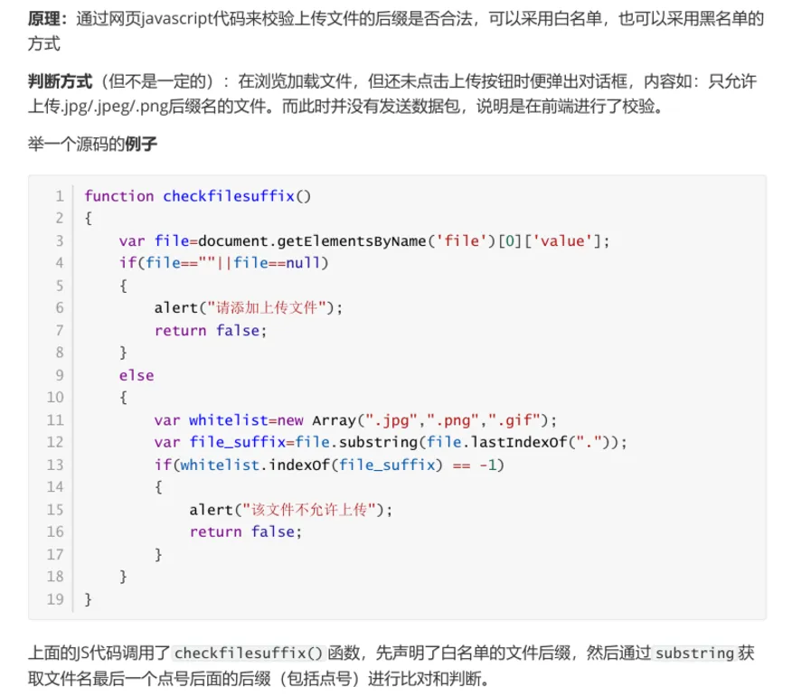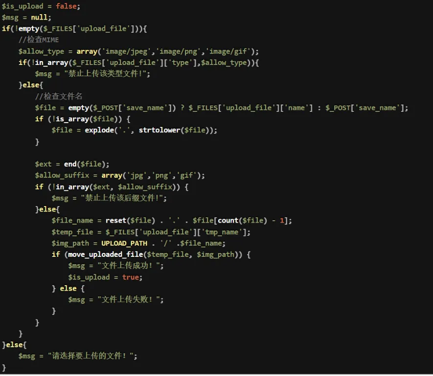 先判断 MIME 类型,然后根据 ‘.’ 来分割文件名,判断最后一个字符串是否在白名单内,是的话就取第一个字符串和最后一个字符串组成文件名再上传