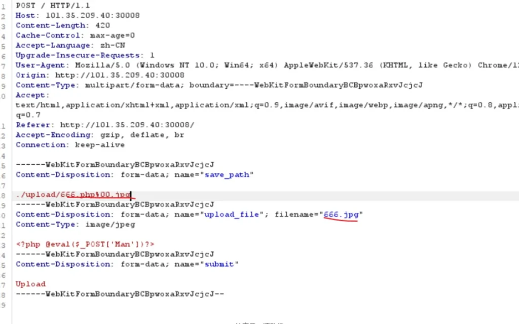 上传一句话木马,将格式改为 jpg ,上传的时候用 bp 抓包,将 jpg 格式改为 php , 然后就可以连蚁剑了,flag在根目录里